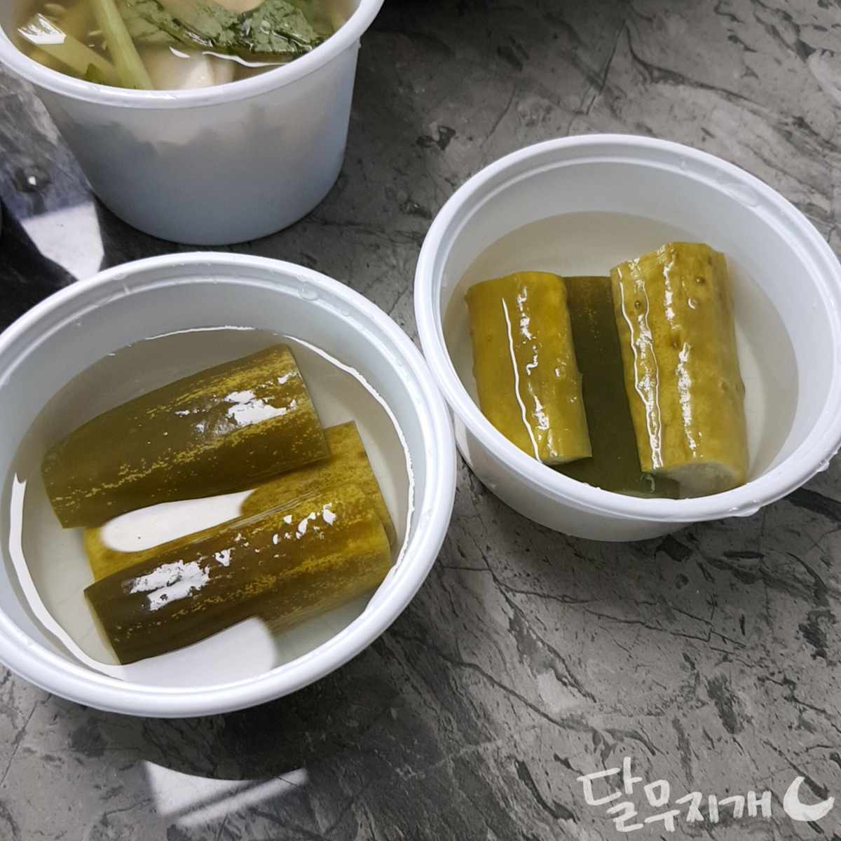 밑반찬으로 온 오이지. 우리 엄마는 오이지를 좋아하는데 엄마 입맛에는 안 맞는 모양이다. 달달한 것이 피클 같다고 했다. 나는 원래 저런 하얀 오이지는 안 좋아해서 안 먹어 봤는데, 오이지가 아니라 피클인 거 아냐?
