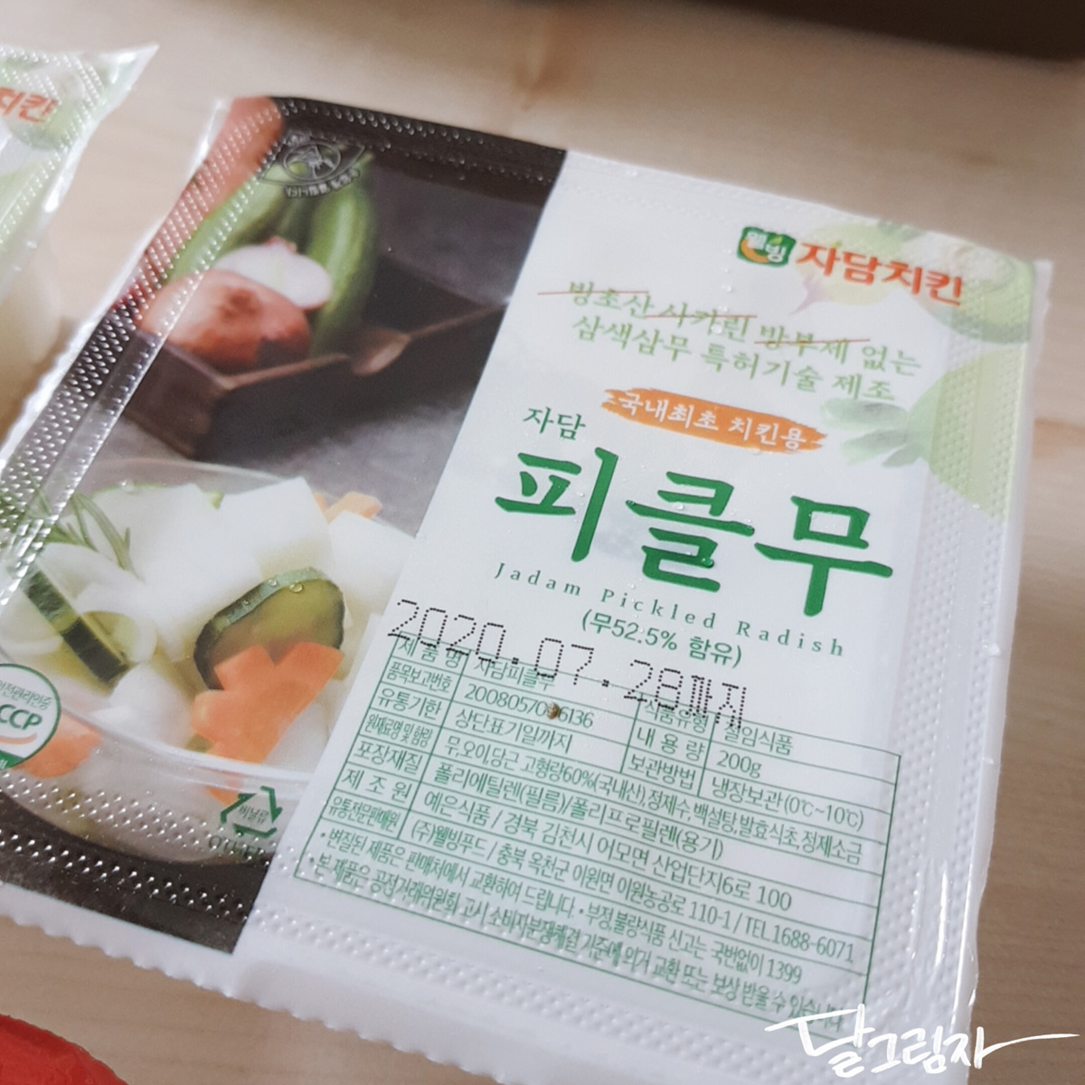 자담치킨 치킨무가 다른 가게들과 좀 달랐는데, 피클무라고 쓰여있었고, 무만 들어 있는 것이 아니라 오이와 당근도 들어있었다. 야채피클같은 느낌? 빙초산, 사카린, 방부제가 안 들어 있는, 치킨무도 신경 쓴 게 보였다. 다만 치킨무의 양이 매우 적게 들어있었다. 보통 다른 치킨무는 네모상자에 두부처럼 네모난 무가 차곡차곡 들어 있다면 여기 꺼는 엉성하게 여유롭게 들어있었다.