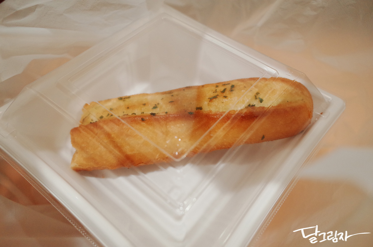 마늘빵은 미니미한 바게트 모양으로 나왔는데, 맛은 쏘쏘, 나는 마늘소스가 많이 묻은걸 좋아해서 만족스럽진 않다. 그냥 식전빵 정도로 먹어야 하는거 같은데 서빙하는 언니가 까먹어서 늦게 나왔다. 그리고 이미 맛난것들을 먹어서 마늘빵에는 손이 잘 안갔다.