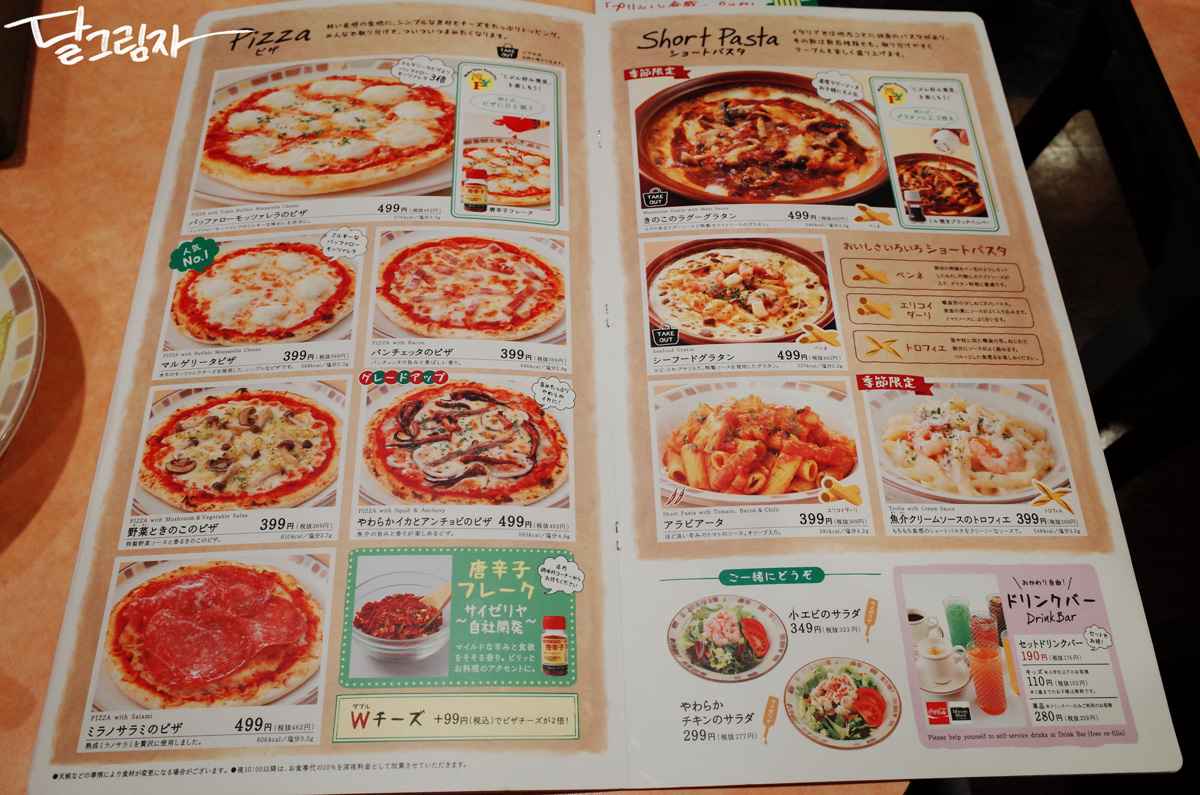메뉴판 장수가 너무 많아서 대표적으로 피자, 파스타, 도리아 부분을 찍어보았다. 보면 알겠지만 500엔 넘는게 없다. 정말 놀라운가격. 혼자 배터지게 먹어도 천엔 좀 넘는다. 가난한 일본유학생으로써 너무나도 끌리는 가격이라고 할수 있다. 친구가 추천해줬던 메뉴는 새우샐러드(小エビサラダ)와 밀라노풍도리아(ミラノ風ドリア), 매운맛치킨(辛味チキン)이었다. 나는 거기에 내가 좋아하는 봉골레스파게티와 마늘빵을 추가했다. 흐흣. 너무 배고프면 정신을 못차리지.